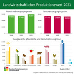 Für die pflanzliche Erzeugung wird von dem Bundesinformationszentrum Landwirtschaft (BZL) ein Produktionswert von 29,7 Milliarden Euro erwartet. Dies ist eine Steigerung von fast acht Prozent gegenüber dem Vorjahr. Allein die höheren Getreidepreise infolge der gestiegenen Nachfrage auf den Märkten führten zu einem Verkaufserlös von sieben Milliarden Euro, was zu einem Anstieg von 42 % führte. Der Wert der Tierproduktion ist mit 26,4 Milliarden Euro leicht gesunken.